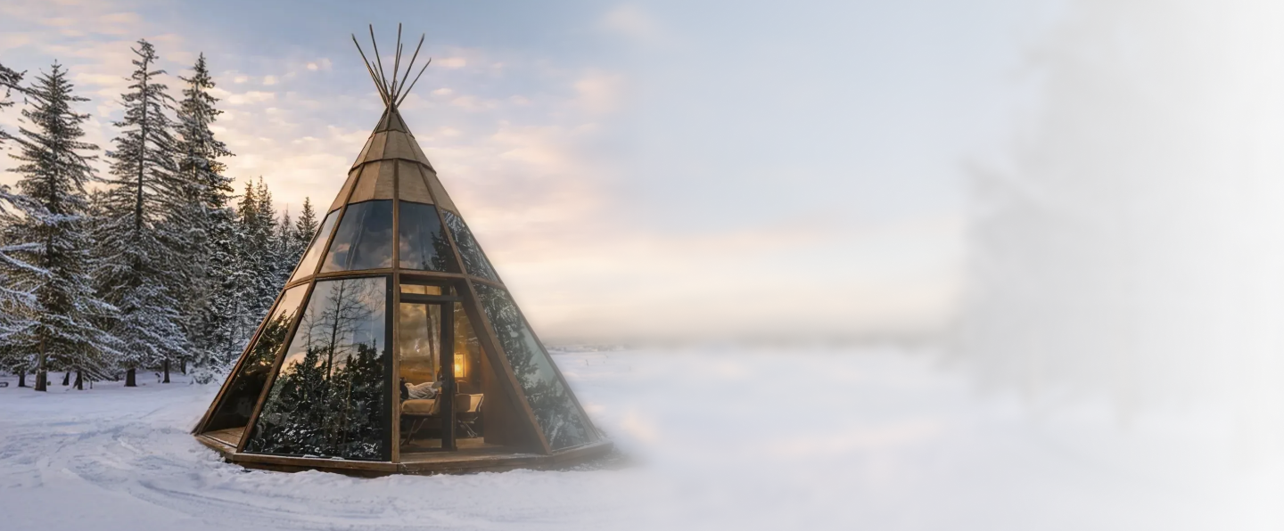 Luxury Glass-Crowned Teepee cabins inspired by Native American design. King bed, full bath, kitchenette, Lake access, Sauna, private Deck and Hot Tub — ideal for couples retreat!
